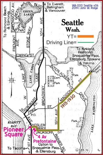 Yellowstone Trail travelers heading east would take a 45-minute ferry ride from Madison St. across Lake Washington, land at Kirkland Landing thence drive along Central Way (Kirkland Ave. today), then 80th St. and on eastward.