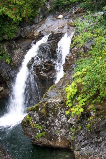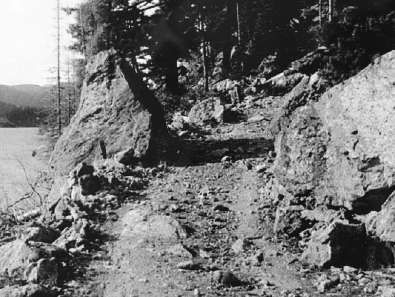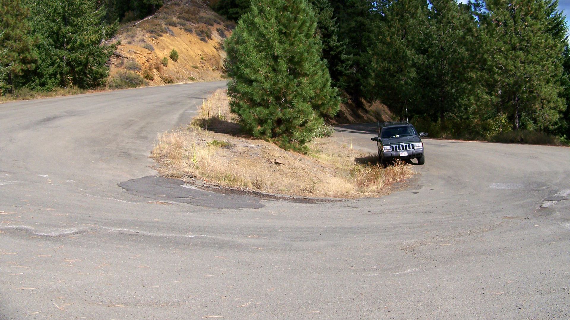 Because of washouts and debris on the road, the upper horseshoe of the 1915 road (dotted black line on map, near G) was closed at a fairly recent, but unknown, date. It can be seen at: GPS: 47.64371, -120.14724.