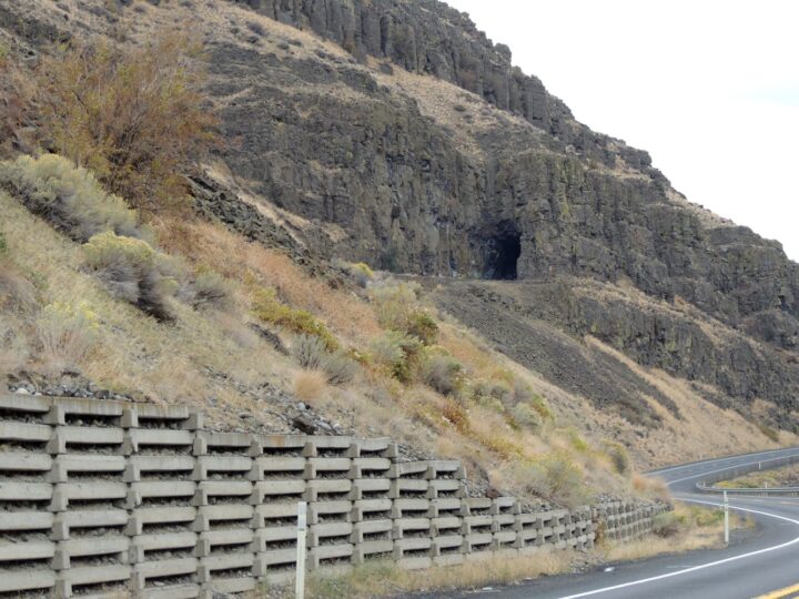 As you follow much of the Trail east of Ellensburg, either the north or south route, you have a whole lot of basaltic rock under (and sometimes around) you. Between six and 17 million years ago, most of it about 15.6 million years ago, lava welled up in many places (not volcanoes) in the neighborhood and filled in the entire area of eastern Washington (and into Idaho and Oregon). Actually, it covered up then-existing mountains and valleys, leaving them now, in places, up to 3,000 feet below the new surface. So much lava that the whole area sank so that the surface was at about the same elevation as before the magma came. A lot of that basaltic rock is now seen in layers in erosion cuts in many, many places, such as at Palouse Falls, Dry Falls south of Coulee City and the east shore of Banks Lake in Grand Coulee on your way to Grand Coulee Dam.