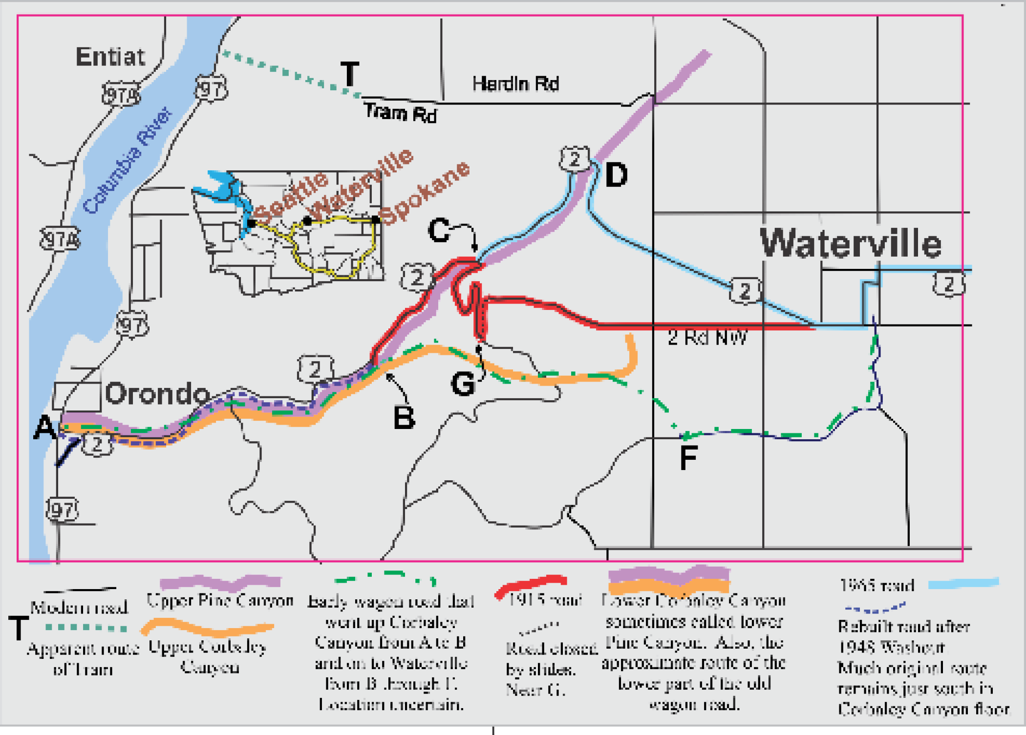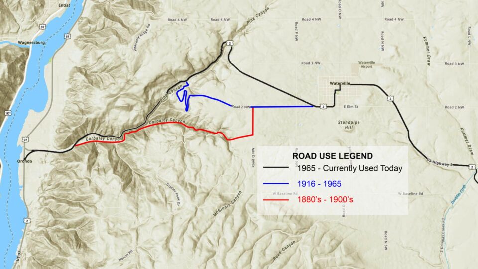 Arksey also reports that beginning around 1885 a wagon road was created running from Waterville through Corbaley Canyon to the Columbia River. (The dot-dash green line.)