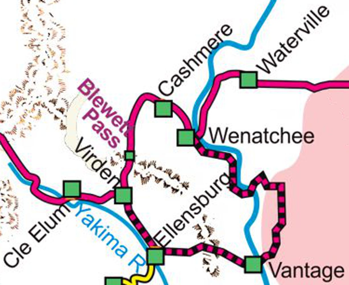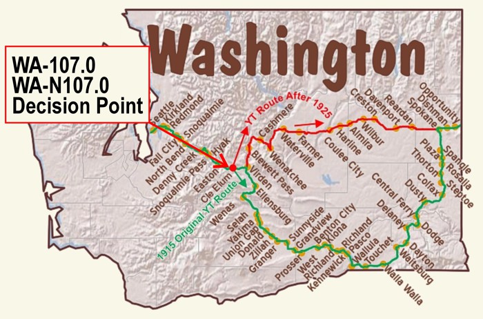 During 1925, the Yellowstone Trail between Spokane and Cle Elum in Washington was rerouted from the southern Walla Walla through Yakima route to the northern Waterville, Wenatchee, Blewett Pass route after the Blewett Pass had been sufficiently upgraded.